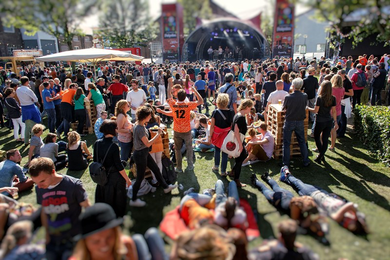 Het terrein in de Spoorzone staat vol met kleurrijke barretjes en de geuren vanuit de eetkraampjes van verse friet, vis en hamburgers komen je tegemoet. De oosterse klanken die de band Söndörgö creërt, maken dat veel mensen in het kunstgras bij het podium meewiegen op de muziek. De zon schijnt feller dan verwacht, de spanning voor het WK Voetbal stijgt en dat zorgt voor de juiste sfeer. ‘Ik vind het hier veel leuker dan in het Leijpark’, vertelt een bezoeker. ‘Nu kun je ook naar binnen, dus als het slecht weer is, zijn de optredens ook leuk.’