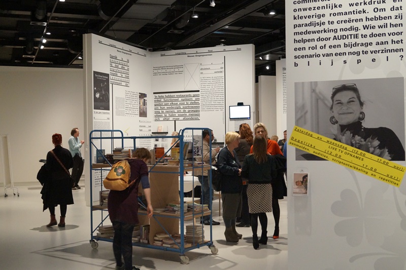 Het kunstenaarsduo plaatste in de expositieruimte grote kartonnen borden, met daarop quotes, televisieschermen met TEDtalks over geluk, columns en andere verhalen over zoeken naar geluk (zie afbeelding 1). In plaats van de suppoosten die normaal gesproken de museumzaal bewaken, voerden zij de ‘Supersuppoost’ in. De ene dag was dit een filosofe, de andere dag een theatermaker. Deze suppoosten gaan in gesprek met bezoekers over gelukkig zijn en creëren zo ook nieuwe omgangsvormen.[25]