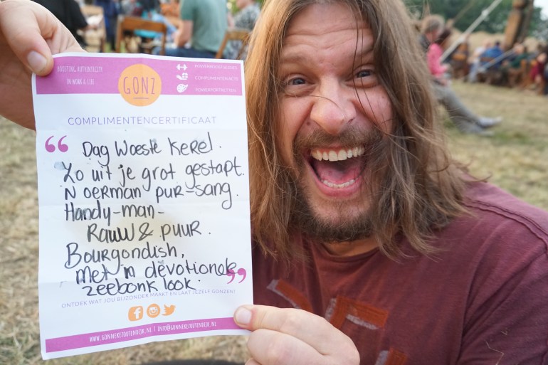 De Complimenteurs van GONZ laten diverse festivalbezoekers stralen. De complimenten butlers kijken om zich heen, nemen personen volledig in zich op om tot een lief, stoer en persoonlijk compliment te komen. En ja, ze serveren de complimenten ook nog eens op een dienblad.
