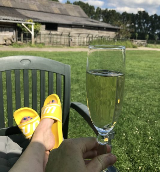Inmiddels ben ik gewend aan de campingsfeer, dus zonder gêne trek ik mijn ANWB-slippers aan en schenk een wijntje in. ’s Avonds komen mijn schoonzus en haar vriend nog langs. Toch fijn, dan denken de andere campinggasten in ieder geval niet dat ik helemaal sneu ben. En natuurlijk gezellig dat ze langskomen, haha.