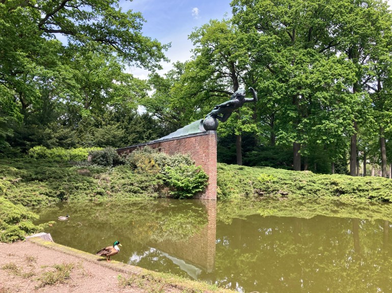 Een eenden echtpaar zit nietsvermoedend aan de rand van de vijver in het Stadswandelpark in Eindhoven, niet doorhebbend welk gigantisch beeld er boven hun schattige kopjes hangt. Een levensgroot monument van een nymf met uitgestrekte arm, buigt namelijk metershoog boven hen over het water heen.