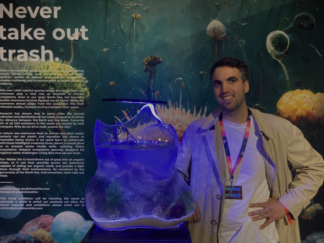 ,,The Living Bin is een experimenteel ontwerp dat ingaat op het afvalprobleem dat we in de wereld hebben. Er rijden ontzettend veel afvaltrucks rond die vervuilend zijn, om ons vuilnis op te halen. Dus dacht ik: ‘Hoe mooi zou het zijn als we ons eigen lokaal ecosysteem hebben, dat ons afval verwerkt’. Daarvoor heb ik onderzoek gedaan in de Noordzee, naar wat er leeft en ik kwam erachter dat die heel kleurrijk en biodivers is. De rodepaardenannemoon is de prullenbak in de zee, dus die leeft in mijn Living Bin. We gaan echt naar een toekomst waarin organismen ons afval op kunnen eten. Dit is op kleine schaal een experiment, maar dit wordt de realiteit.