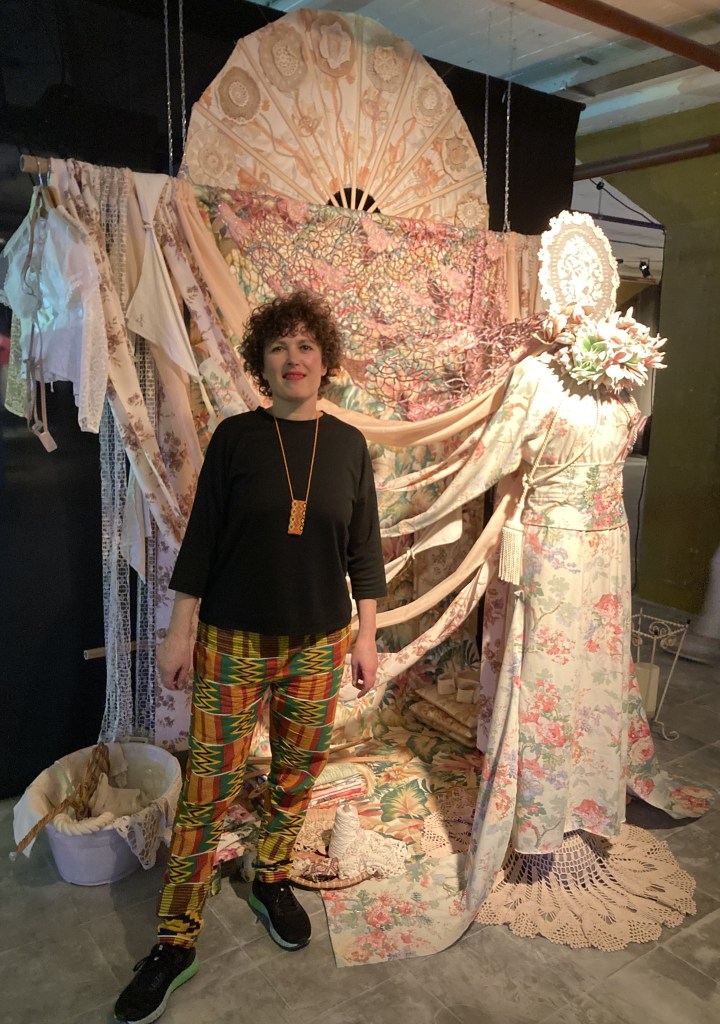 ,,Hergebruik is een centraal thema bij mij. Mensen om mij heen weten dat ik met stoffen werk, dus ze geven me regelmatig overgebleven stoffen. Zo heb ik bij één van de textielcollages in de waaiers op de achtergrond de zelfgemaakte kleedjes verwerkt van mijn oma, overgrootoma en die van de oma van een vriendin. Dat vind ik mooi, zo krijgt het een verhaal.”