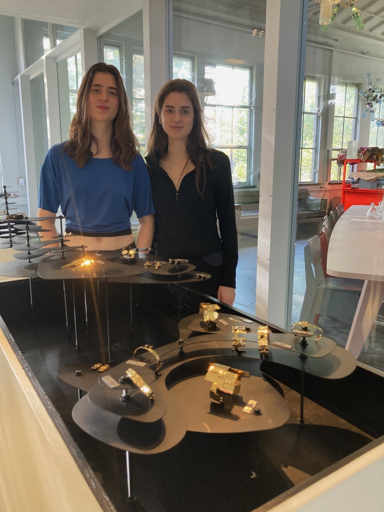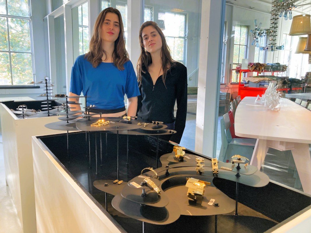 De tweelingzussen hebben hun eigen werkruimte in het pand van Piet Hein Eek (hun vader red.) en laten tijdens de Dutch Design Week twee nieuwe collecties zien. ,,We hebben dubbel zoveel gemaakt dit jaar, want we wilden veel uitproberen. Voor ons is duurzaam produceren belangrijk. Daarom werken we alleen met high tech-fabrieken in Nederland en met sommige machines uit de werkplaats in het pand waar ze zitten. Ook het plaatmateriaal waaruit we de sieraden maken, is vaak restafval. Daarnaast zorgen we ervoor dat de machine maar één keer aan hoeft, dan maken we het ontwerp zo dat het tegelijk met een ander product mee kan.”