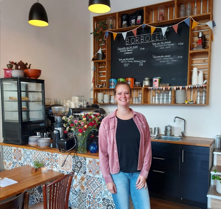 “Bij Borboleta komen mensen voor de ontspannen, warme sfeer en voor de lekkere gerechten. We maken veel van de producten zelf, zoals de hummus, spreads en de taarten. We hebben een open keuken, dus gasten kunnen meekijken hoe we hun broodjes, soep en tosti’s maken. Ook het sociale aspect is belangrijk voor mij, want Borboleta is een sociale onderneming”, vertelt Willeke van Renssen. Ze heeft ruim 5,5 jaar haar eigen lunchzaak Borboleta in de Lange Hezelstraat.