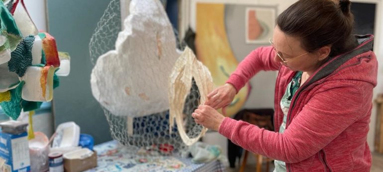 “Het liefst wil ik dat mijn werk mensen raakt, dat het ze wat doet. Stof, gips, schuim; die materialen, dat tactiele, waarbij ik mijn handen gebruik, dat typeert mij. Er zit iets onafs in. Dat hele fijne en nette, dat maak ik niet”, vertelt Pieta van Twist (48), ze zit in haar laatste jaar van de opleiding Docent Beeldende Kunst en Vormgeving Op Maat bij de Academie voor Art & Design van ArtEZ in Zwolle. In haar eindwerk staat ‘de ruimte’ centraal. Pieta vertelt over haar werk en ervaringen in de afgelopen jaren.