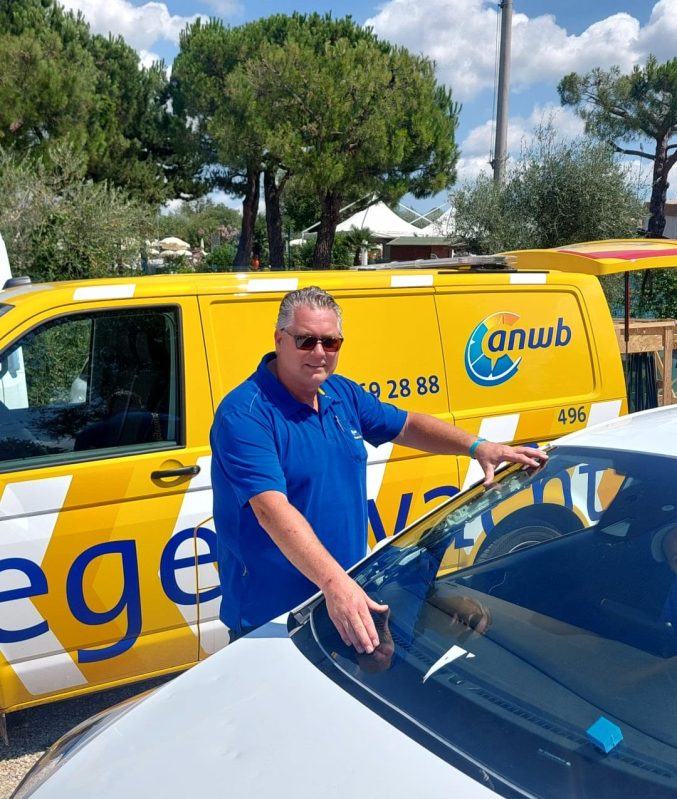 In zijn dagelijkse werk helpt ANWB-wegenwacht René Nouws (53) mensen met pech in de regio Breda, deze week schiet hij gestrande Nederlanders aan het Gardameer in Italië te hulp. ,,We blijven tot onze missie hier klaar is.”