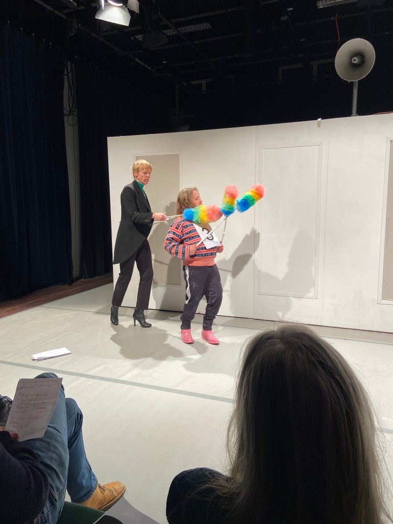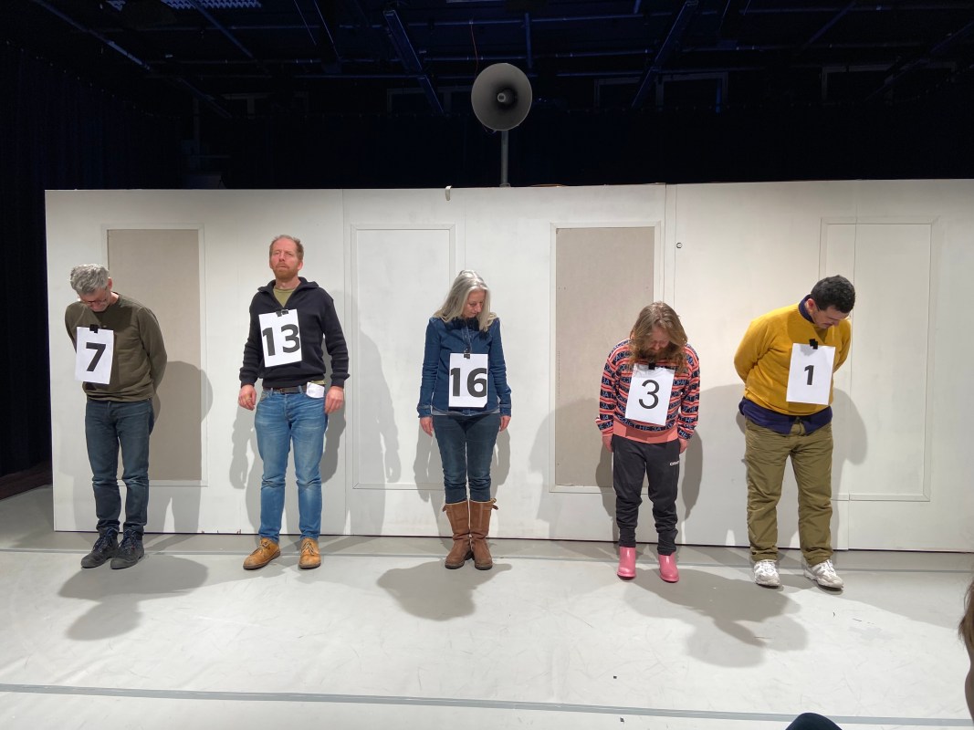 ,,Ja, ga maar zitten. Je nummer goed zichtbaar op je borst houden. We beginnen zo met de audities.” Artemis-speler Willemijn Zevenhuijzen dirigeert het publiek naar een plaats in de zaal. De eerste ronde audities gaat van start; de bezoekers zijn onmiddellijk deel van de voorstelling. ,,Jij daar, nummer 4, kom maar naar voren. Nummer 5 ook, ja. En nummer 3”, roept ze de bezoekers toe.