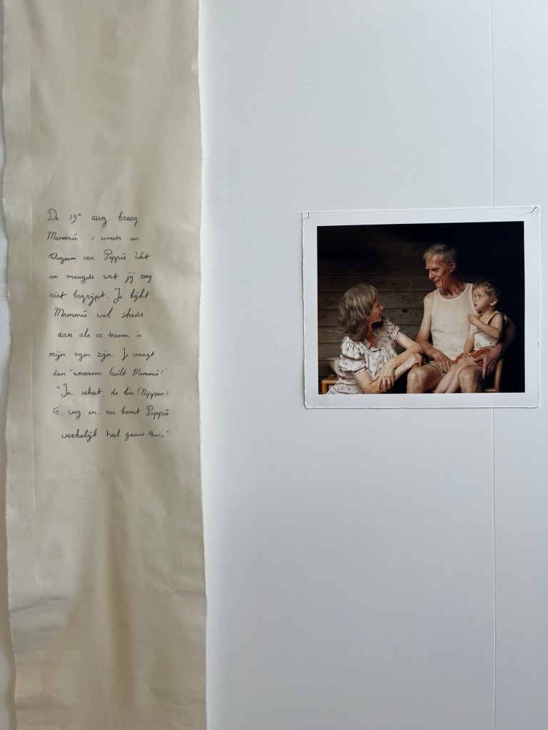 ‘Pappie moet nu maar gauw thuiskomen hè prulleke, je bent alweer 19 maandjes’. Op een groot wit doek op de expo heeft Kleijn fragmenten uit haar oma’s dagboek uitgeschreven.