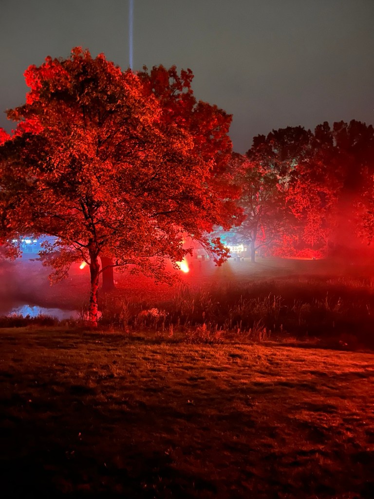 Verscholen tussen de bomen doemt een blauwlichtgevend lichtsculptuur op. Een langzaam draaiend geheel, zachte muziek klinkt op de achtergrond. Hoe langer je kijkt, hoe rustiger je wordt. Het is één van de twaalf werken waarlangs bezoekers dwalen tijdens de vijfde editie van Schemerlicht in het Goffertpark.